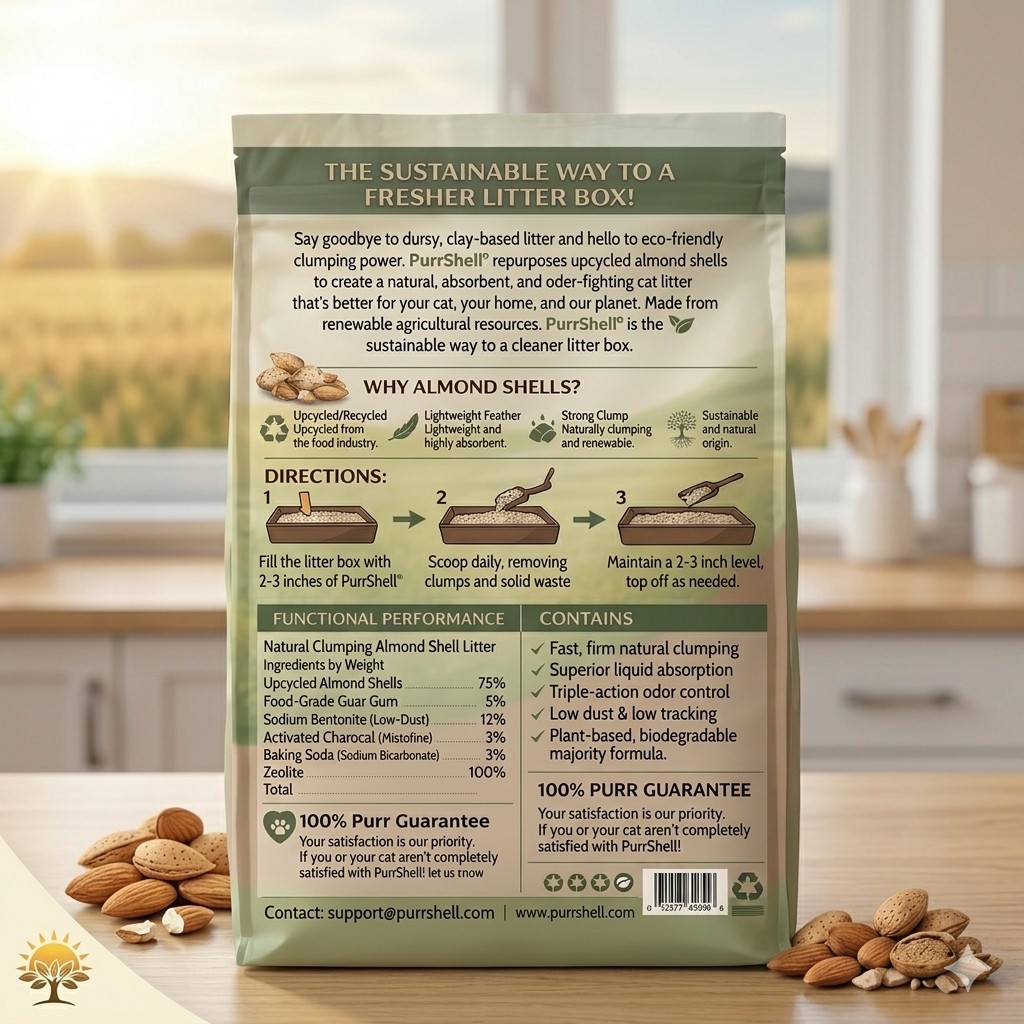 A natural cat litter made from upcycled almond shells delivering strong clumping, low dust performance, and odor control.